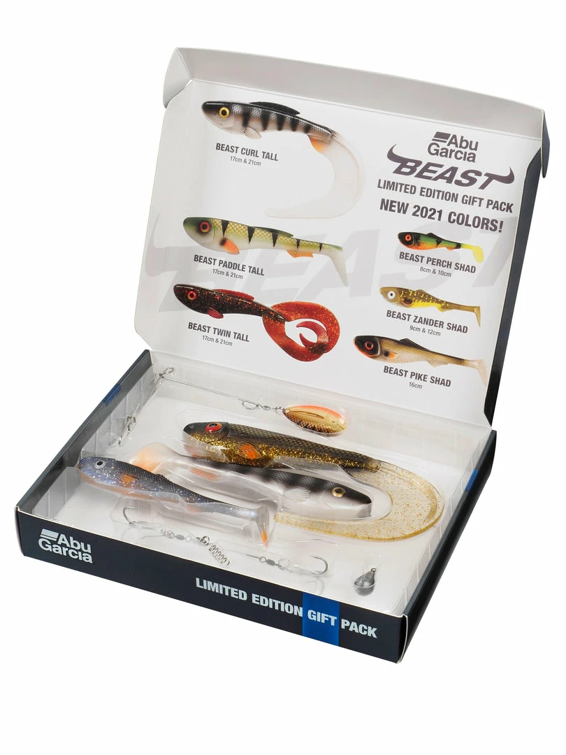 This limited-edition Abu Garcia Beast gift pack offers you three exciting Beast softbaits including the right components to rig them. In the box you will find a Beast Paddle tail 17cm, a Beast Curl tail 21cm and a Beast Pike shad 16cm.