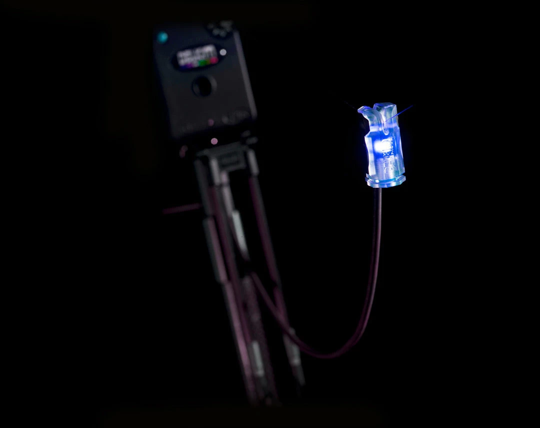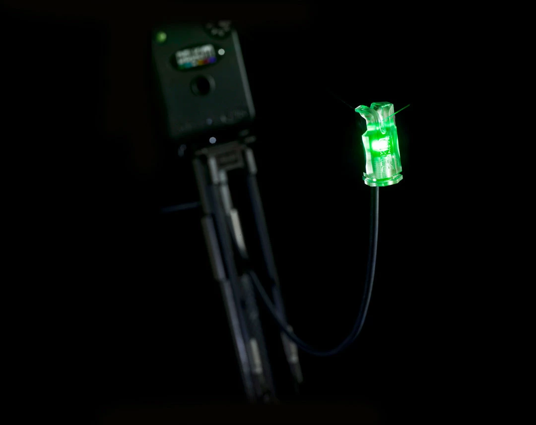 The Delkim NiteLite® Pro is a complete illuminating hanger, line clip and bite alarm attachment all in one.  It performs just like a chain with the unique patented CatFlex™ cable assembly that gives good tensile strength and allows the fine wires needed to connect to the bite alarm to be protected and encased in a flexible black stainless steel coil. It replicates all the Delkim alarms’ LED functions, flashing latching, brightness adjustment and Night Marking WITHOUT ADDITIONAL BATTERIES. It also has a patented self-adjusting integral magnetic ball clip which makes the old style adjustable types redundant.
