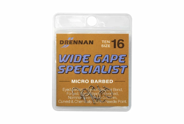 Wide Gape Specialist Micro Barbed hooks are short-shank, eyed and have a bronze finish.