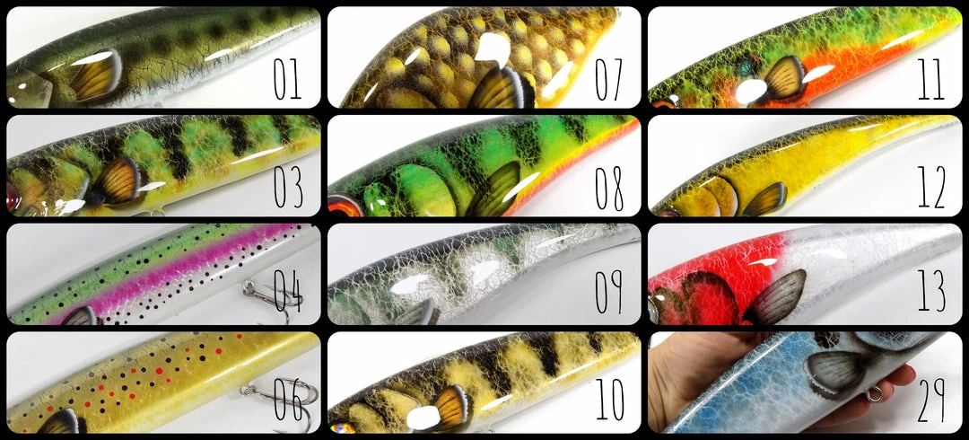 Every lure that comes out of our workshop has been hand painted with no patterns, pure out of hand art, therefore each one is unique and there cannot be two of the same kind.