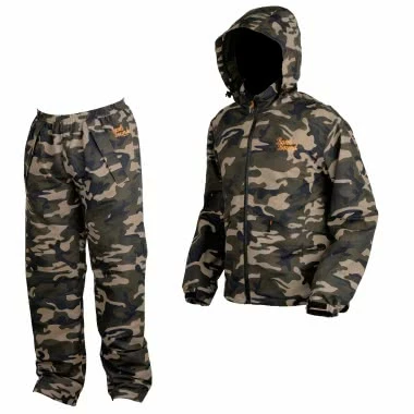 Manufactured with a uniform camouflage pattern throughout, this waterproof, lightweight jacket and trouser combo ensures that you are ready for whatever the weather throws at you.