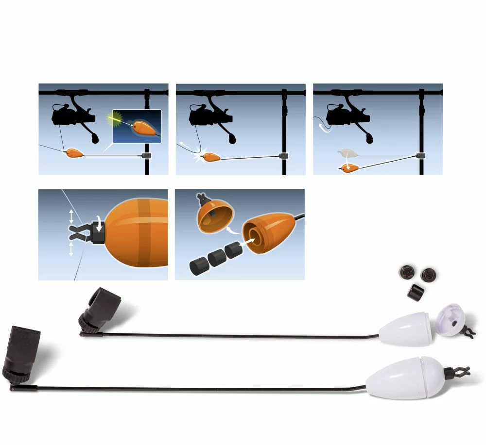 It is simply mounted on the rear bank stick. The rotary clamp adapts to any bar thickness. The bite indicator is the plastic egg that can be opened and adjusted with weights inside – depending on the wind and current. The arm moves freely and indicates both runs and drops.