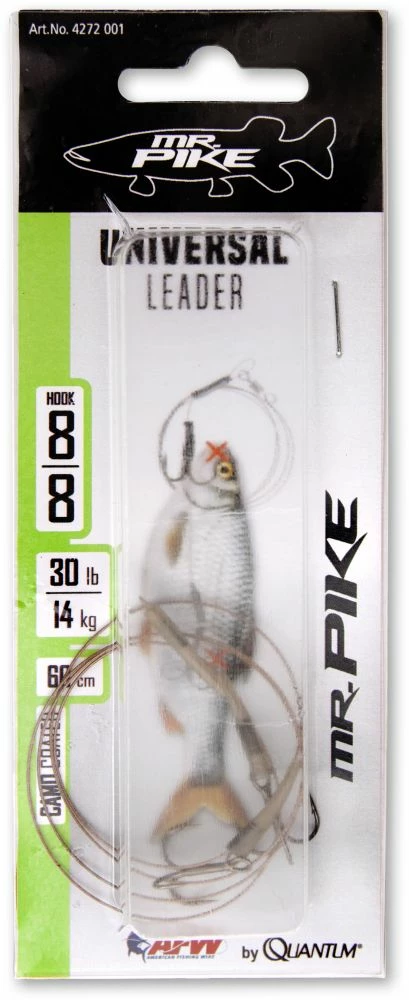 Mr. Pike Universal Leader: ready-made rigs for float fishing and basic fishing, equipped with high-quality carbon steel hooks tied to 30lbs (14kg) unpleasant camo steel leader. Great emphasis was placed on high-quality workmanship, each compression sleeve connection is individually manufactured by hand and subjected to a final inspection.