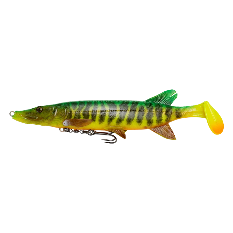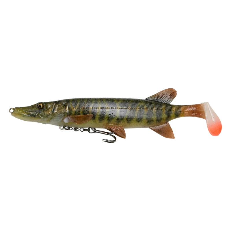 The belly-mounted treble hook is attached to a swivel, making it very difficult for a pike to throw the hook during a fight. The paddle tail make the lure rock seductively and the rattle in the tail sends out provoking clicks