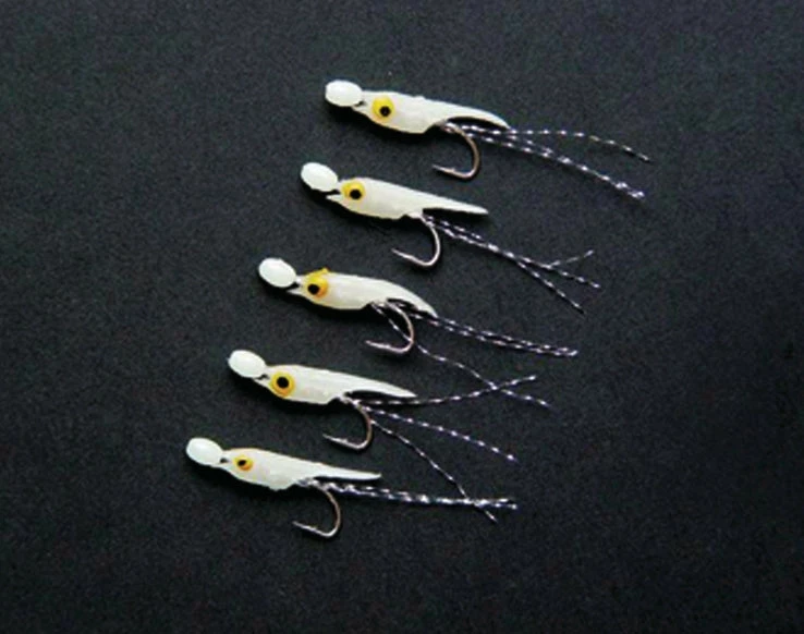 Mini glow in the dark shrimp rig with flash sparkle tail. 5 hook rig.